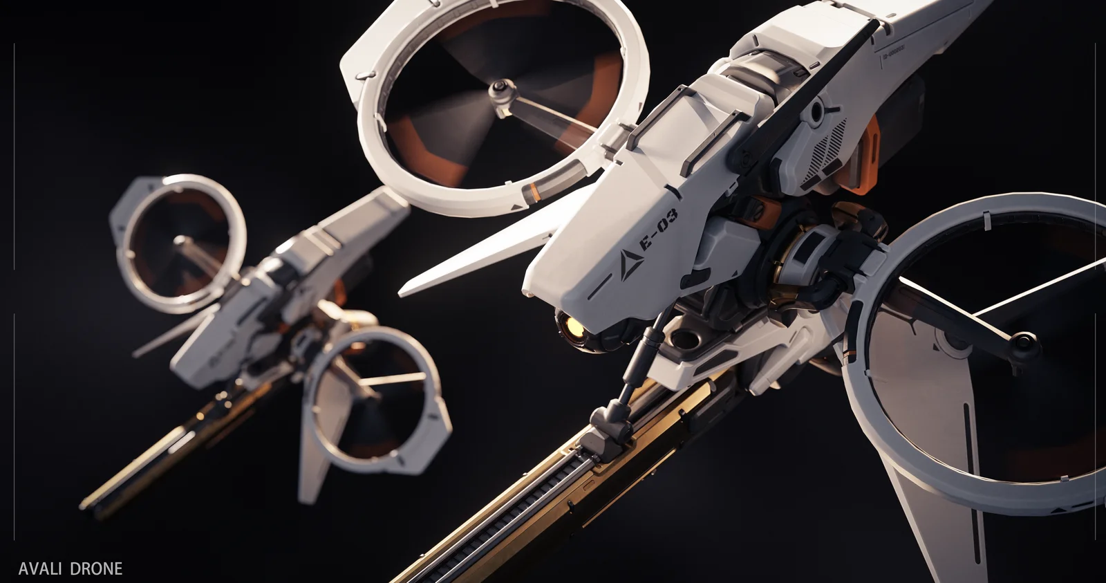 A 3D model of an Avali patrol drone equipped with a magnetic gun, designed primarily for rendering purposes. The model features a rigged armature with Inverse Kinematics (IK) setups for easier posing and animation. The asset includes three 4K texture sets and provides two preset texture variations. The package provides a native Blender file alongside FBX, Unitypackage, and Substance 3D Painter files, with a total polygon count of approximately 78,000 between the drone and its weapon.