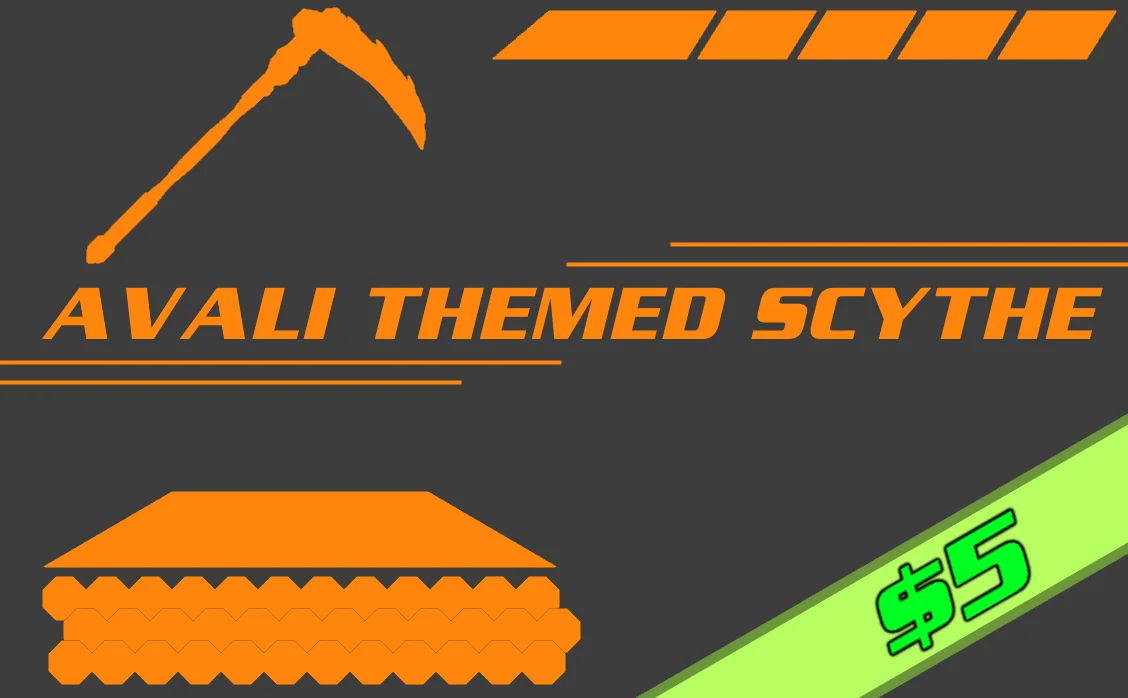 A 3D model of an Avali-themed scythe weapon. The asset is designed for use as a prop with personal avatars and can be modified or recolored. It includes both FBX and Blender project files.