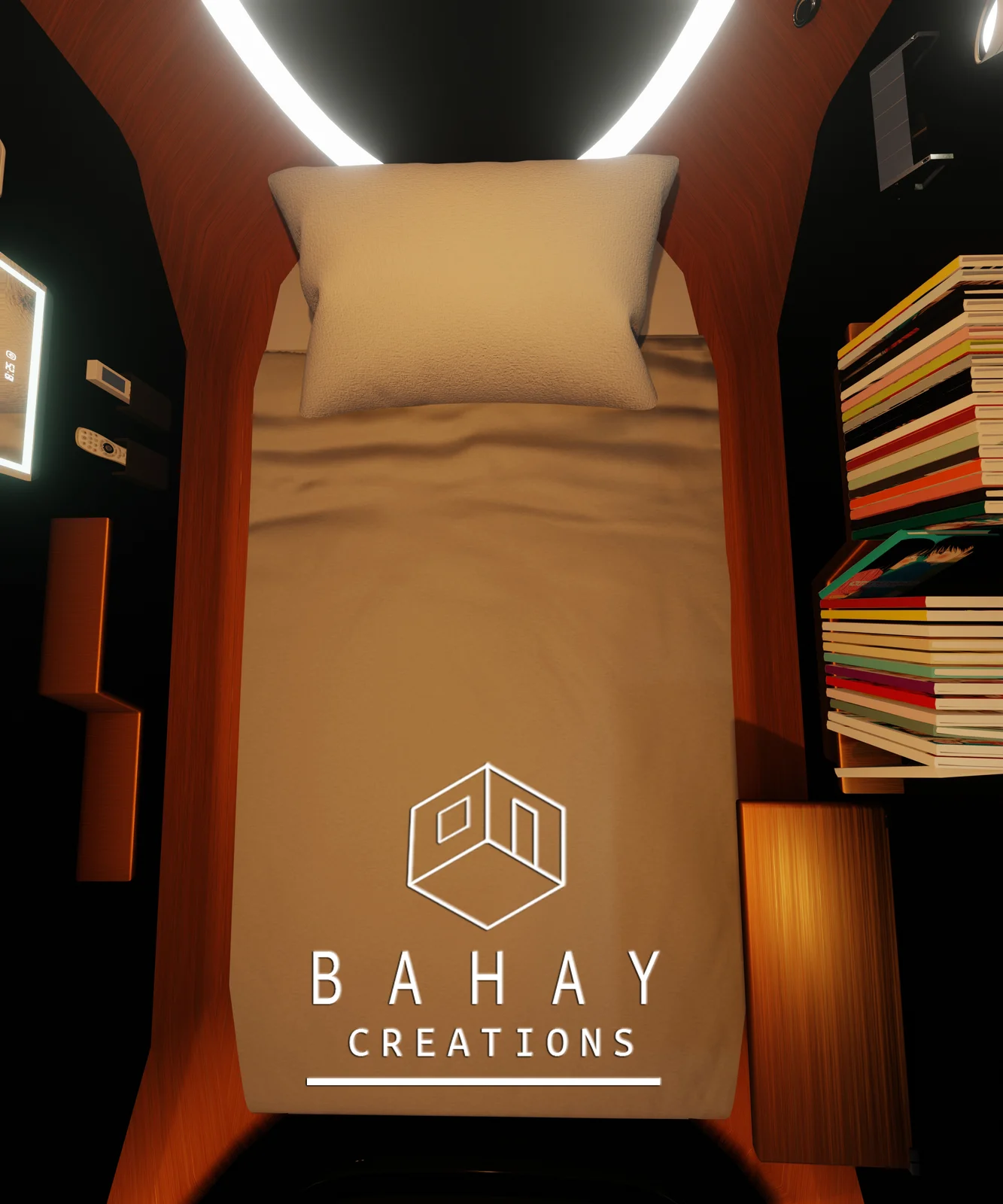 A 3D interior scene of a Japanese-style capsule hotel, also known as a pod hotel. The environment includes a hallway with double-stacked rows of sleeping pods and an individual capsule bed interior. The scene is compatible with both the Cycles and EEVEE render engines.