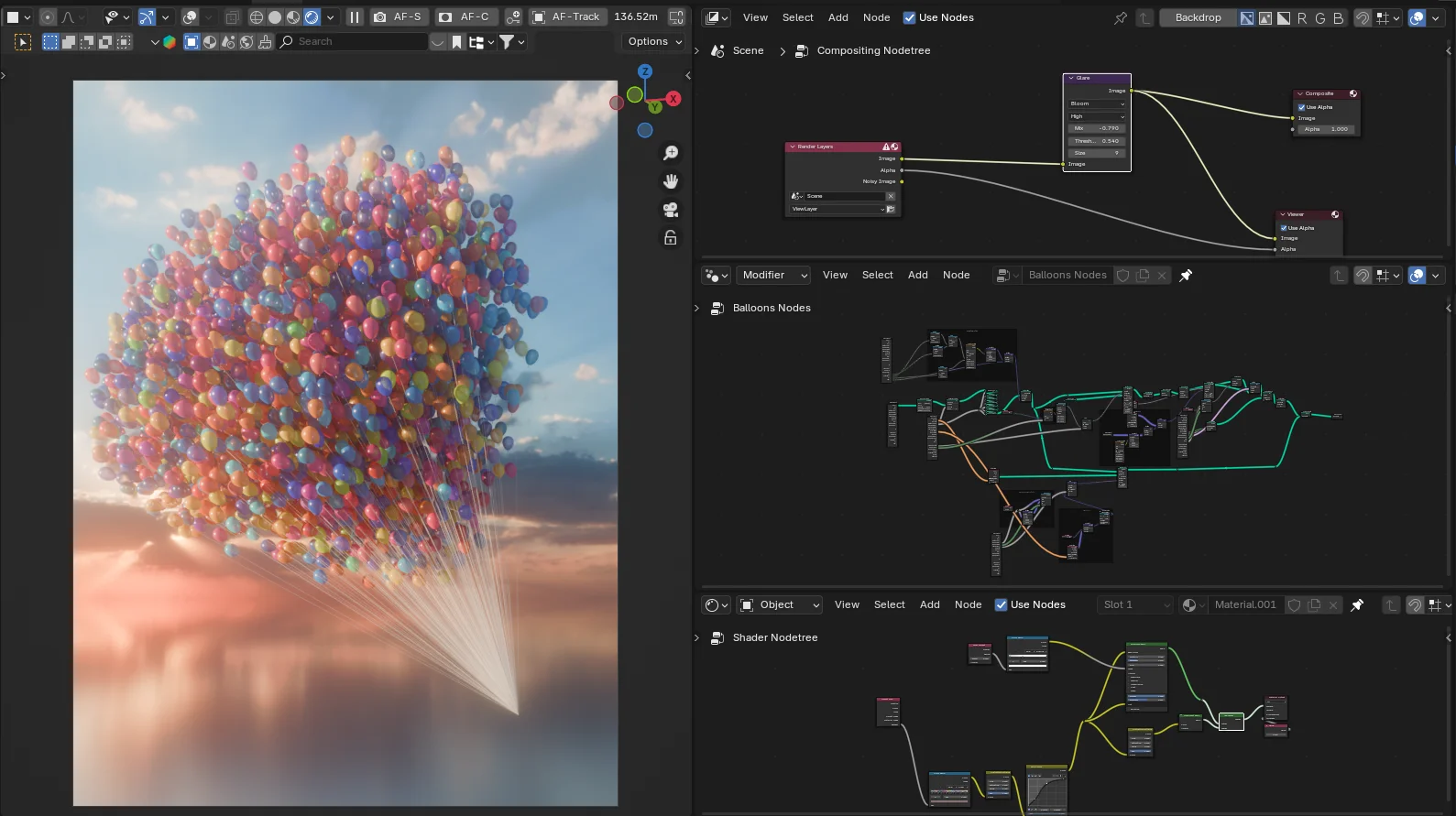 This Geometry Nodes setup generates clusters of balloons on target geometry using point instancing. The system includes built-in noise parameters that simulate floating and wind movement, which can be animated directly from the modifier panel.