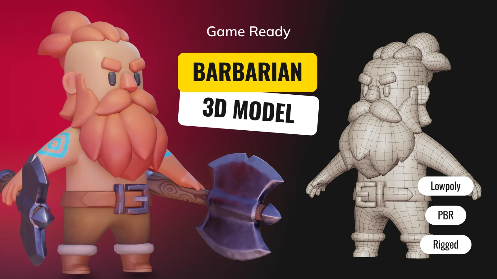This product features a rigged, low-poly barbarian character model and an accompanying axe prop. The character is manually retopologized and built from separate objects, allowing you to hide or swap specific components as needed.