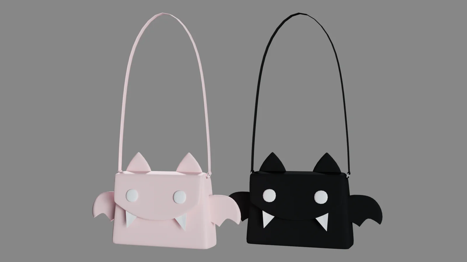 This is a 3D model of a bat-shaped bag, suitable for character accessories. The model consists of 10,496 triangles and includes both an unrigged FBX version and a PMX version configured with physics for use as a crossbody bag. It comes with two PNG texture variations in pink and black.