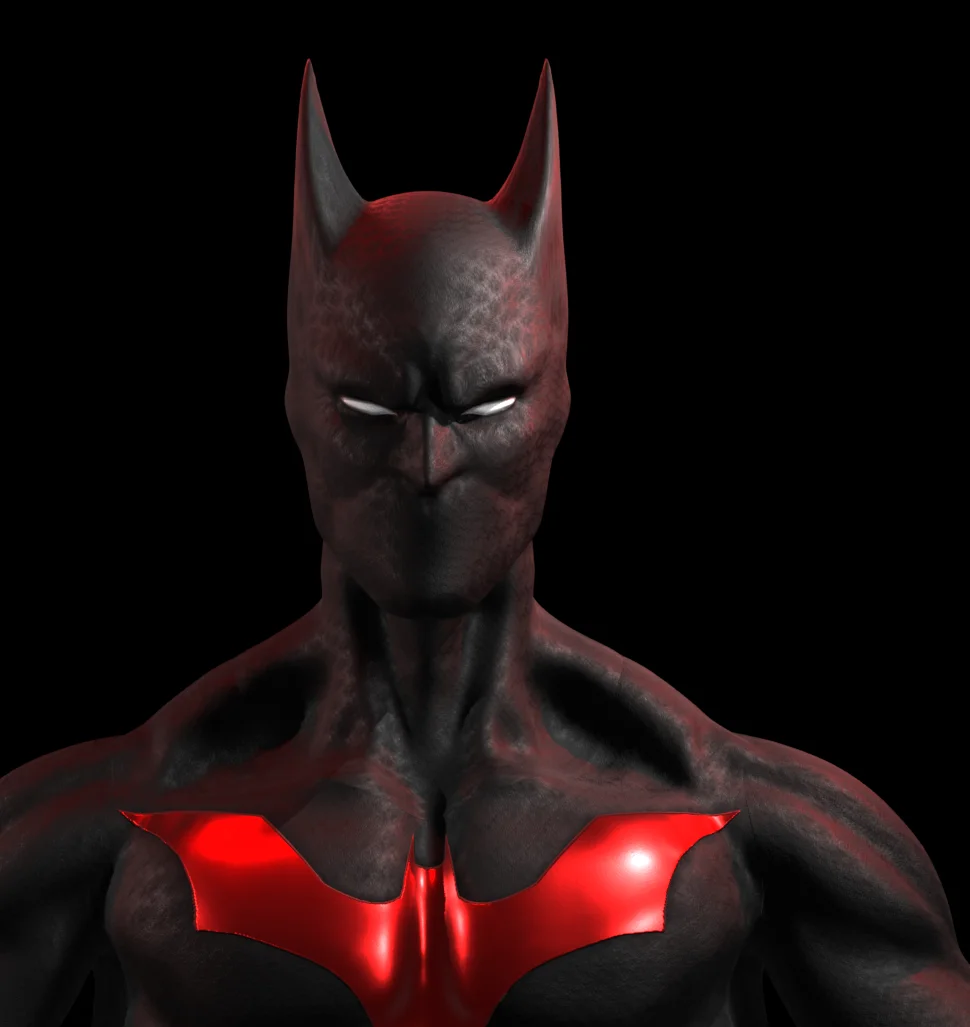 A 3D character model of Batman Beyond built upon a custom base mesh. The model includes a complete armature rig for posing and animation, as well as facial rigging to support mouth movements.