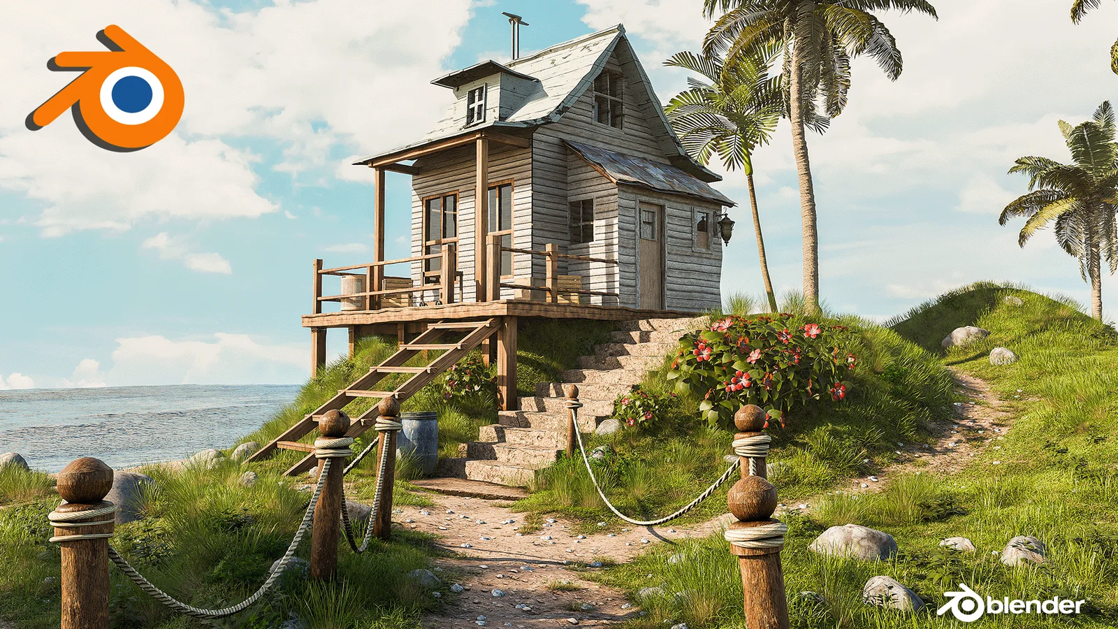 A complete 3D beach house environment scene. The project is provided as a .blend file and was originally constructed using Blender 4.3 alongside Photoshop.