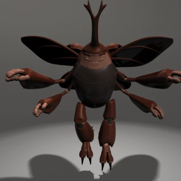 A fully rigged original beetle character model featuring four arms. The rig includes IK and FK controls on all limbs with uniform arm control for both sides. It comes with a joint-based facial setup for expressions and posing. The character features deployable wings with independent left and right controls, along with an automatic wing flap function. Materials and wing texture images are included.