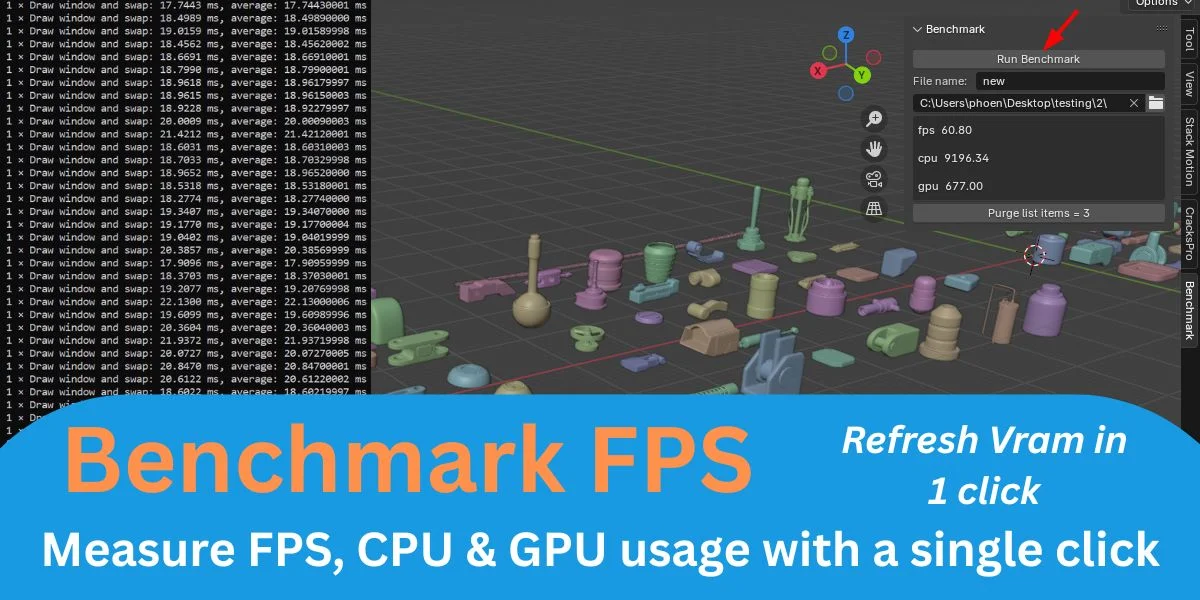 This add-on provides tools to benchmark viewport performance directly within Blender. Users can measure frames per second (FPS), CPU usage, and GPU usage with a single click while viewing real-time visual feedback in the user interface. It automatically exports the benchmark data to a structured JSON file for further analysis. A built-in purge tool is included to clear previous results.