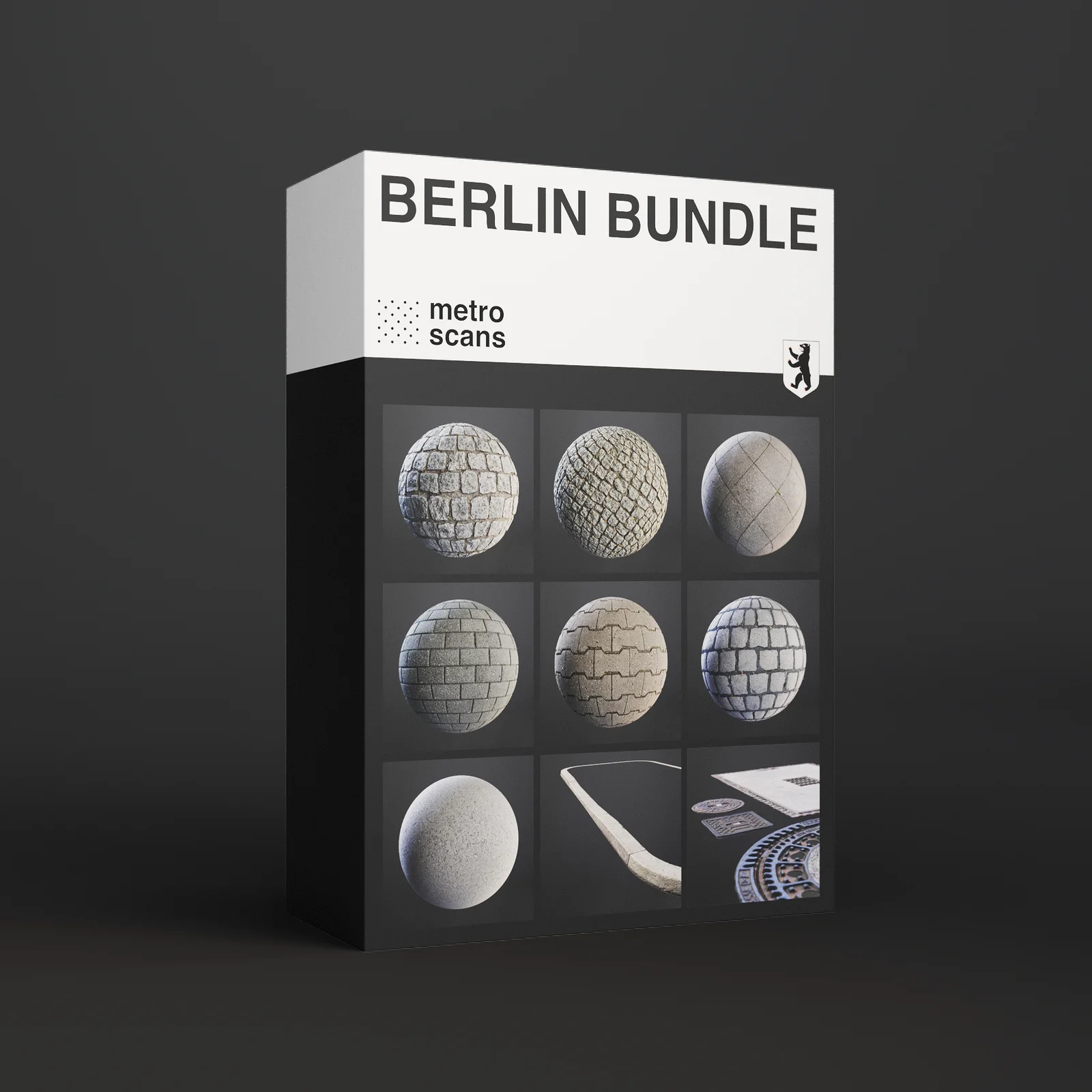 The Berlin Bundle provides nine pavement surface assets commonly found throughout the city. The set includes asphalt, large and small granite cobblestones, street cobblestones, concrete squares, and running bond concrete patterns, along with standalone manhole cover and granite curb elements.