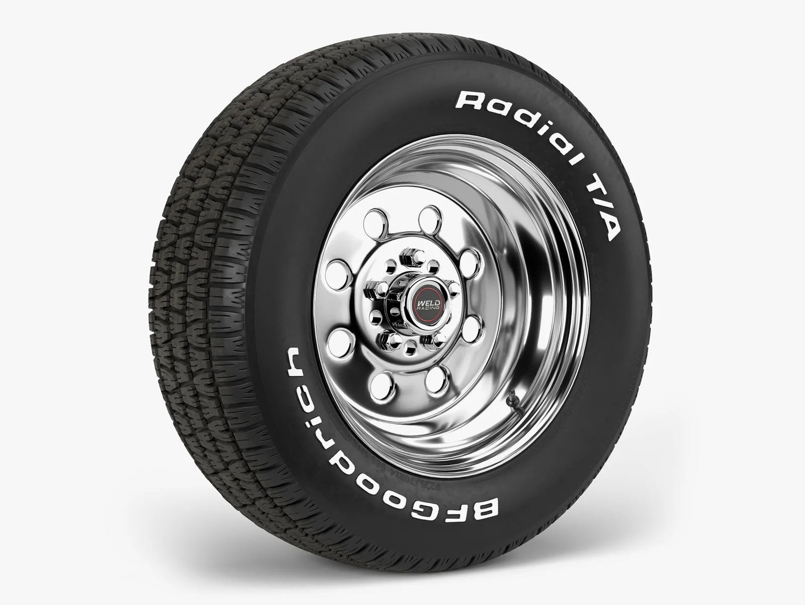 A highly detailed 3D model featuring a BFGoodrich Radial T/A tire mounted on a 15x7-inch Weld Draglite wheel. The asset is built to real-world scale and centered on the X, Y, and Z axes. It utilizes overlapping UVs to maximize texture resolution.
