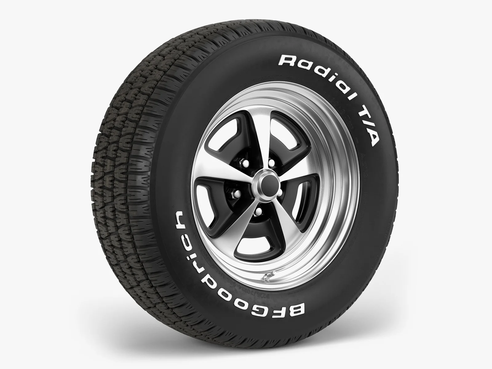 This is a detailed 3D model of a BFGoodrich Radial T/A tire mounted on a 15x7-inch Magnum 500 wheel. Built to real-world scale, the asset features overlapping UVs and detailed geometry, with the tread designed without subdivision surface modifiers.