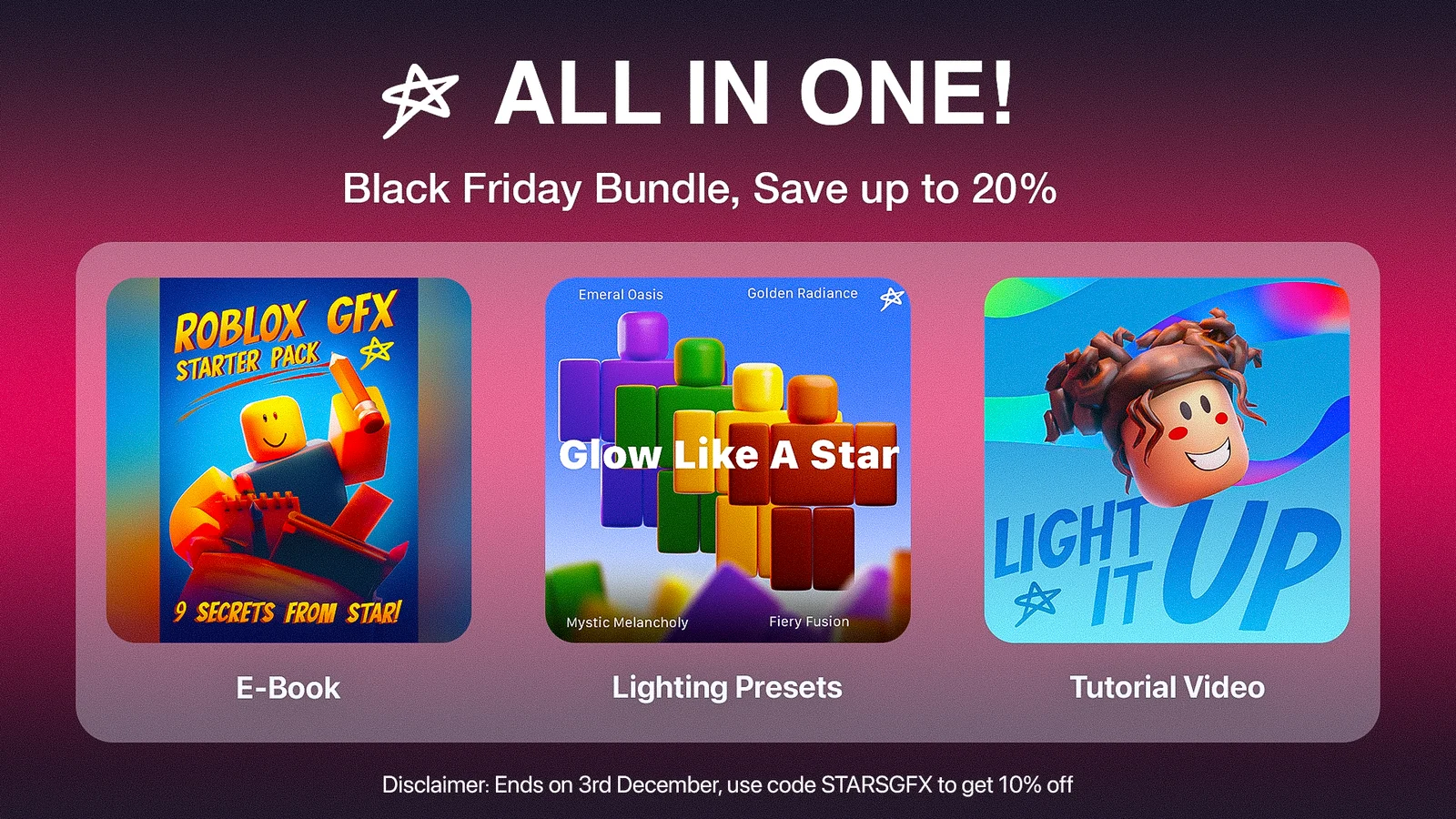 This bundle includes three distinct resources focused on lighting and rendering in Blender, with an emphasis on Roblox graphics. It features a full video tutorial detailing techniques for achieving professional lighting setups. Also included is a pre-configured lighting room template designed to help users study and customize specific lighting aesthetics. Finally, the bundle provides an ebook that compiles resources, tips, and insights for beginners and professionals working with Roblox GFX.