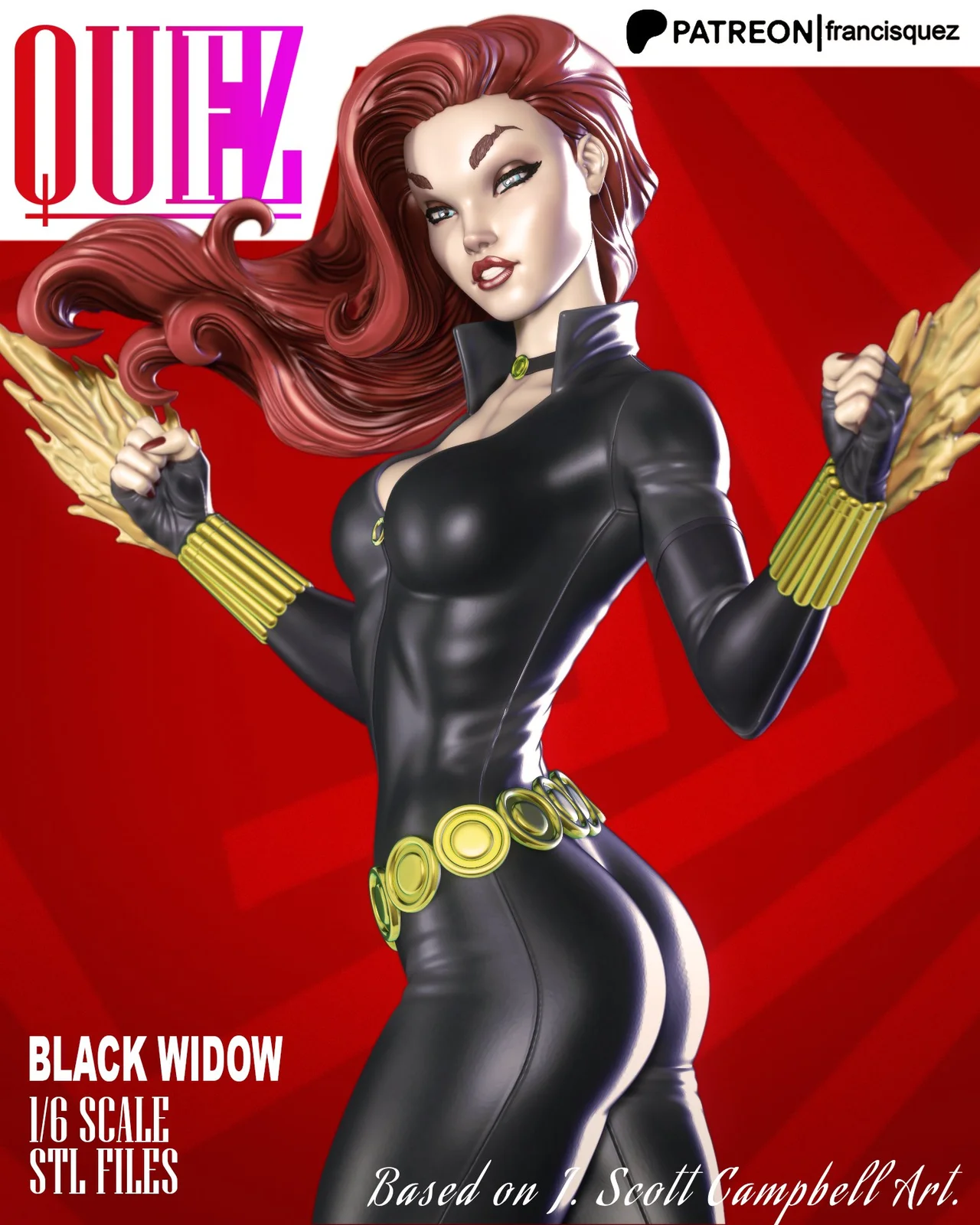 A 3D printable model of the Black Widow character, styled after the artwork of comic book artist J. Scott Campbell. The model is scaled at 1/6, standing roughly 283mm (11 inches) tall. The geometry and parts are optimized specifically for 3D printing workflows and are provided in STL format.