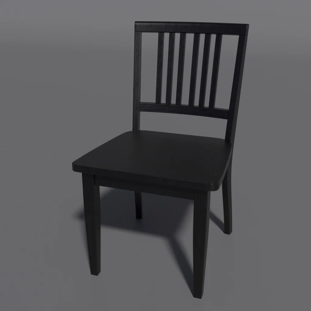 A 3D model of a black wooden chair prop. The product includes a static OBJ file alongside standard PBR texture maps, including ambient occlusion, base color, height, metallic, normal, and roughness. A Substance Painter file is also provided to allow for custom material modifications. Please note that while a rigged version and render setup are included, they are specifically formatted for Maya and Redshift.
