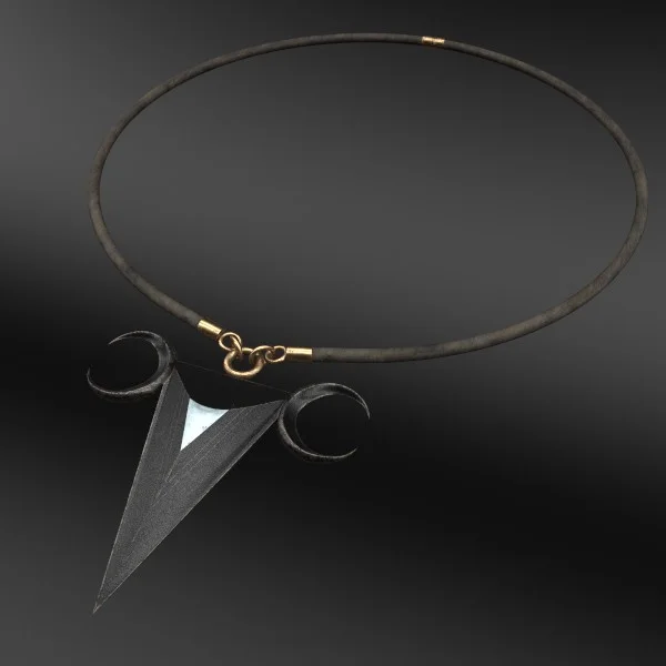 A 3D model of a bladed crescent dagger pendant. The asset includes a rigged leather cord equipped with a master bone, allowing the necklace to be posed and fitted to various character neck proportions. The item is provided in FBX format alongside standard image textures.
