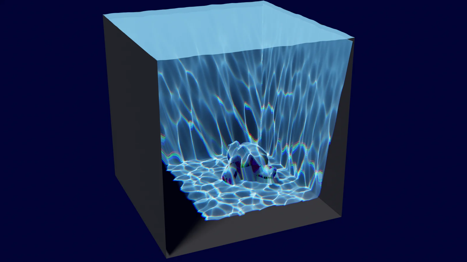 This project file provides a Geometry Nodes setup to simulate a fake caustic water effect. It is designed to work in EEVEE, as Cycles struggles with the generated geometry. The water surface is animated and generated using a noise texture, with adjustable height and complexity.