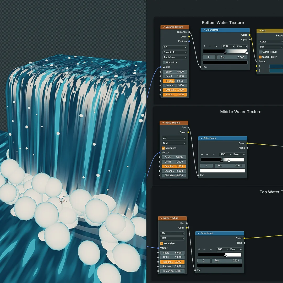 A procedural stylized waterfall material created for Blender. The shader network includes built-in node annotations that explain how the material was constructed, serving as both a ready-to-use scene asset and an educational resource for learning node logic.