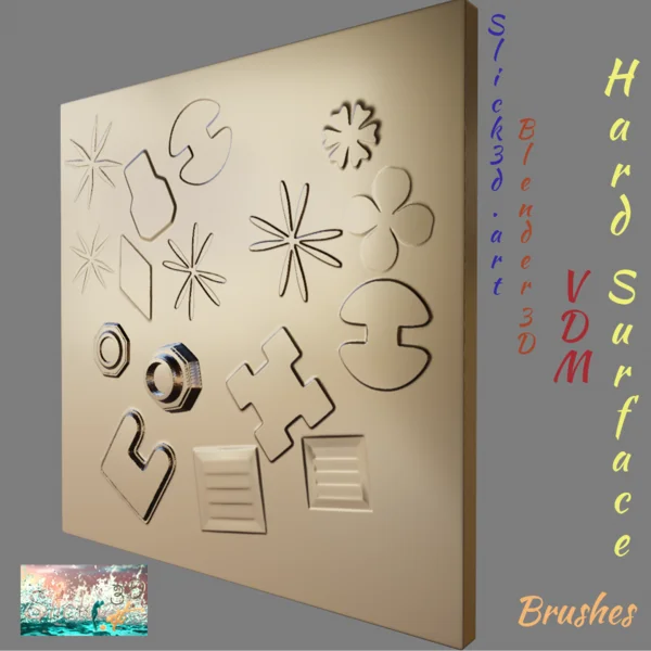 This collection provides 50 vector displacement map (VDM) brushes designed for hard surface sculpting in Blender. The VDM shapes allow users to add complex, directional three-dimensional details to surfaces while working in sculpt mode.