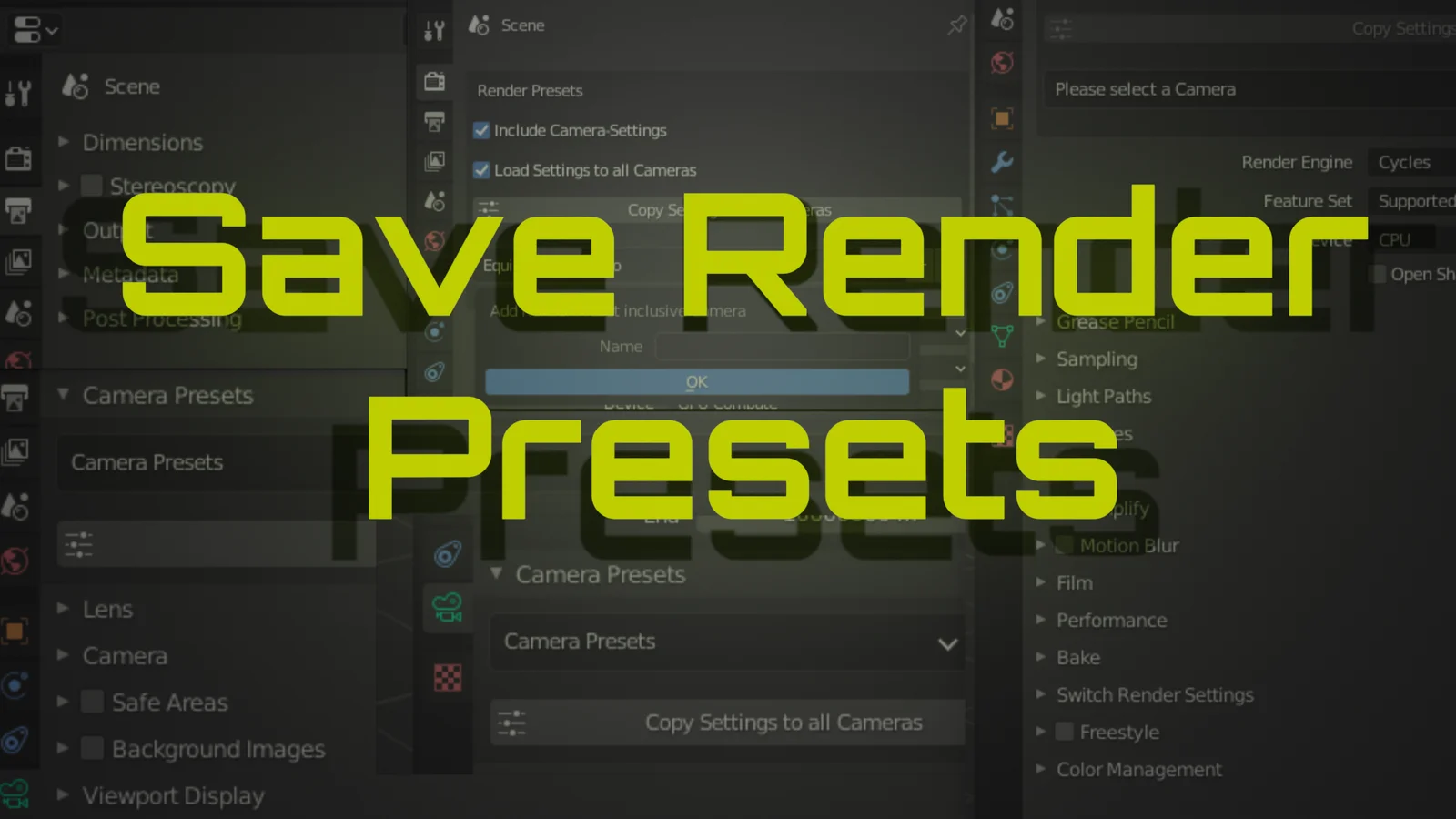Beyond storing presets, the tool includes utility functions for managing scene setups. Users can copy the configuration from the active camera to all other cameras within the scene simultaneously. It also features automatic generation of output paths and filenames based on the current blend file name, which extends to updating labels and colors within file output nodes. Saved presets can be manually edited in Blender's Text Editor or shared with other users.