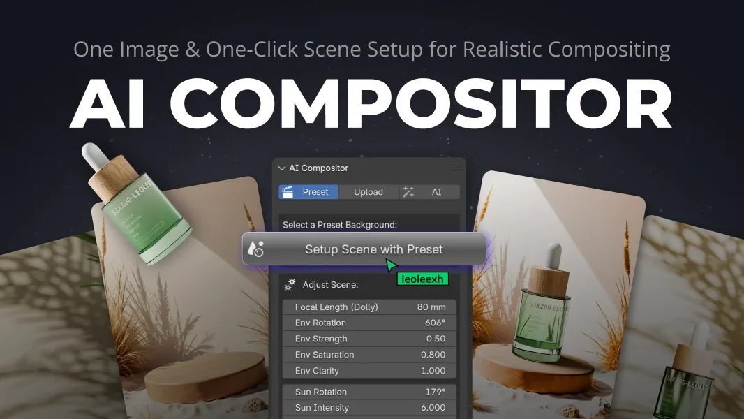 AI Compositor is a scene setup tool that streamlines the process of integrating 3D object renders into 2D backgrounds. Users can provide background images by uploading their own, selecting from built-in presets, or generating new images directly within the 3D Viewport using text prompts via Replicate, Siliconflow, or ComfyUI APIs.