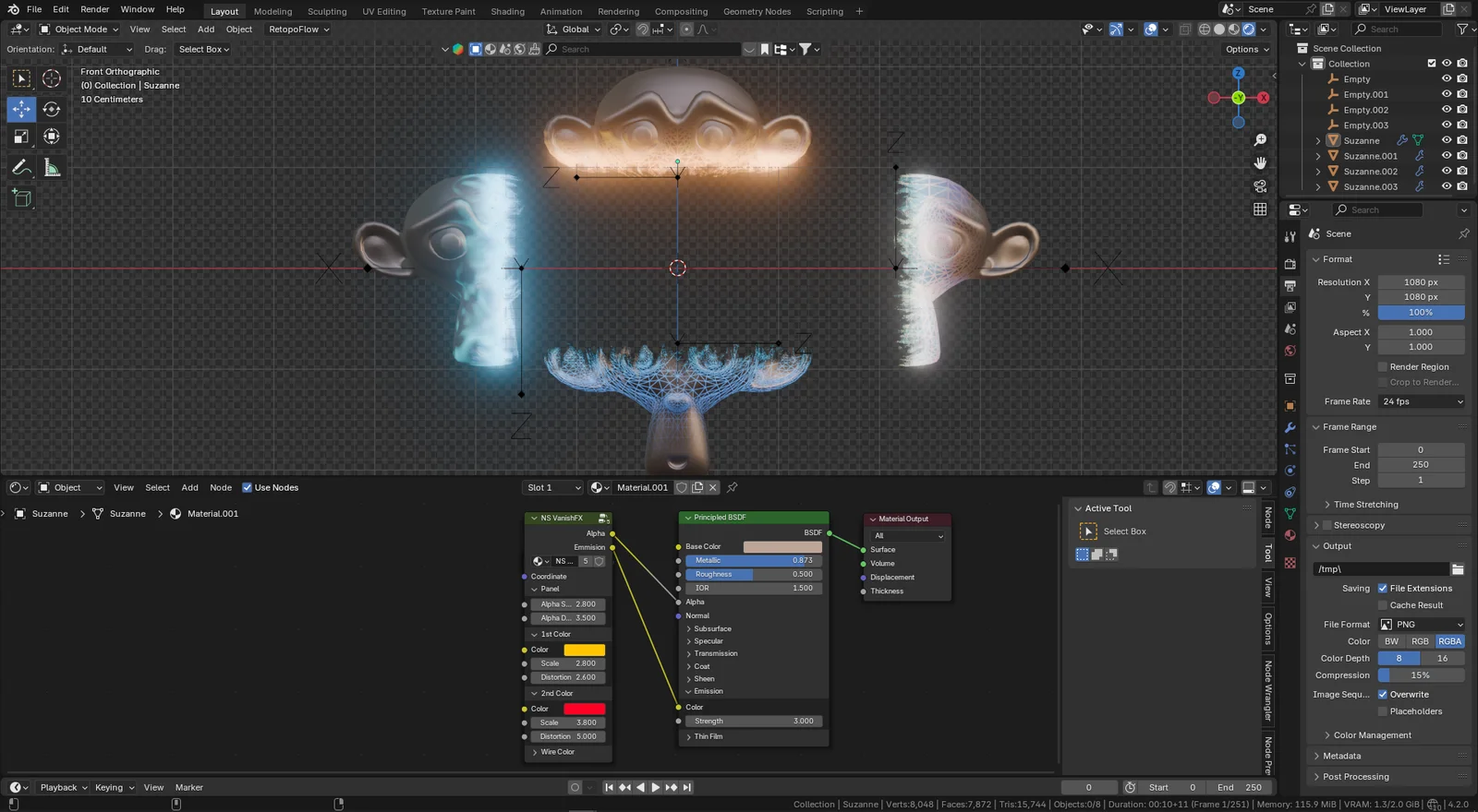 NS VanishFX is an add-on that applies procedural vanish, dissolve, and transition effects to 3D objects. It automates the creation of material node setups used to animate models appearing or disappearing. The generated effect is entirely procedural and requires no external textures. Users can adjust parameters including the effect's intensity, transition speed, direction, and color.
