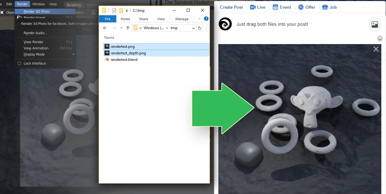 This add-on automates the rendering process required to create 3D photos for Facebook. With a single action, it generates both the standard color render and the corresponding depth map, saving them adjacent to the active blend file with the correct naming conventions for immediate uploading. The setup retains the compositing nodes in the scene, allowing users to manually adjust the depth image gamma for further tuning. It includes a resolution dialog and handles empty world background artifacts by adjusting the black distance color.