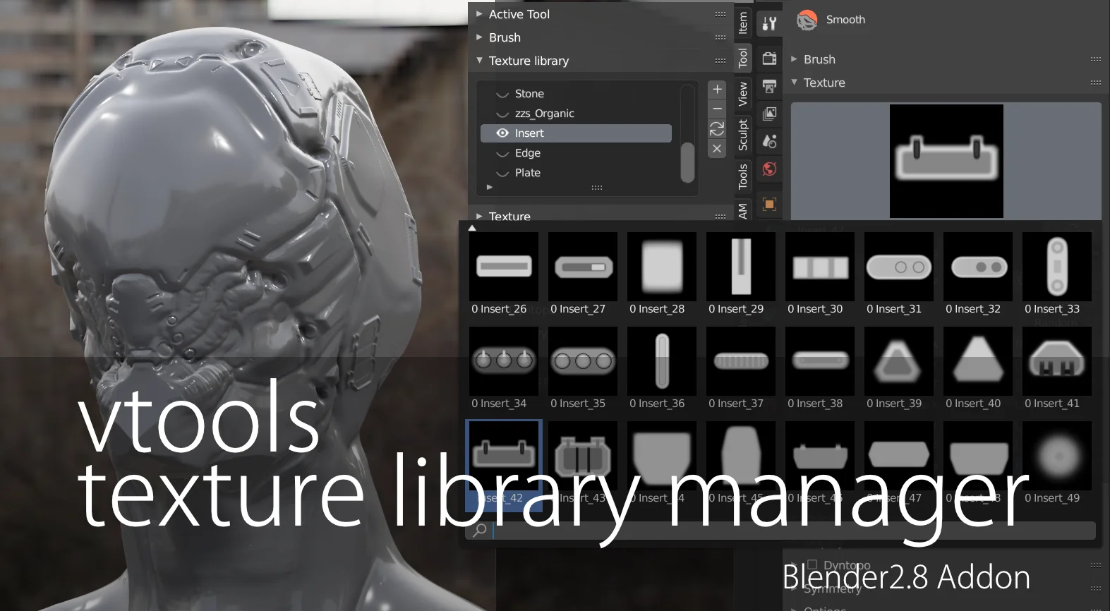 Vtools is a texture library manager that allows you to batch load images and folders. It is particularly useful for loading brush textures for painting and sculpting workflows.