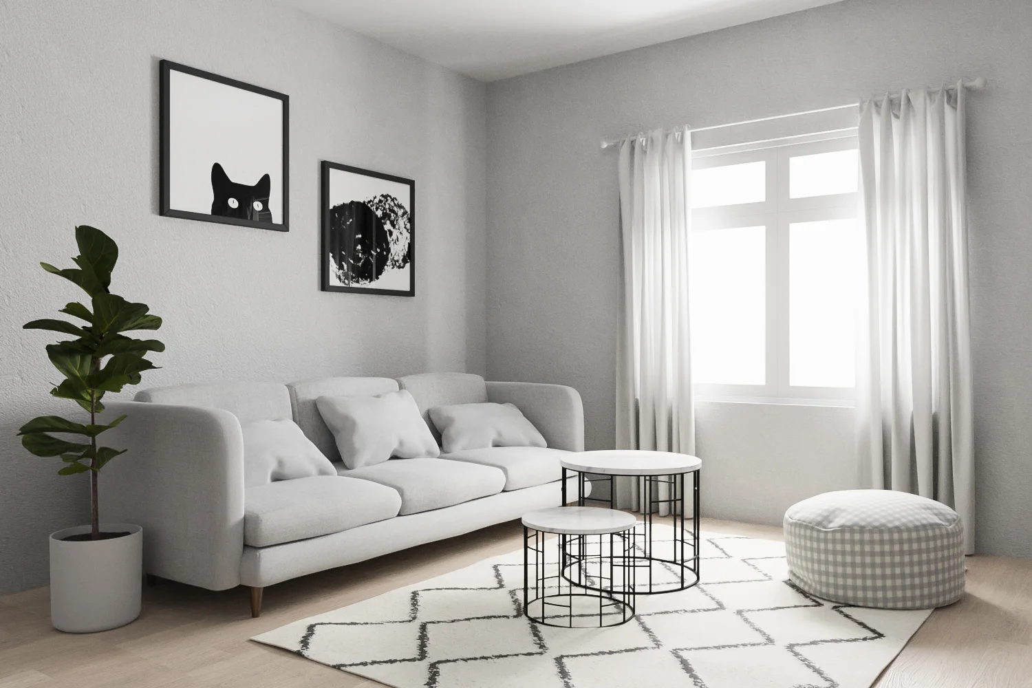 This product contains the completed Blender project file from a tutorial series on creating a Scandinavian style living room. The project file includes the final scene with all associated 3D models and textures. The scene is configured with three distinct lighting setups and two camera views, and includes five rendered images demonstrating the final result.