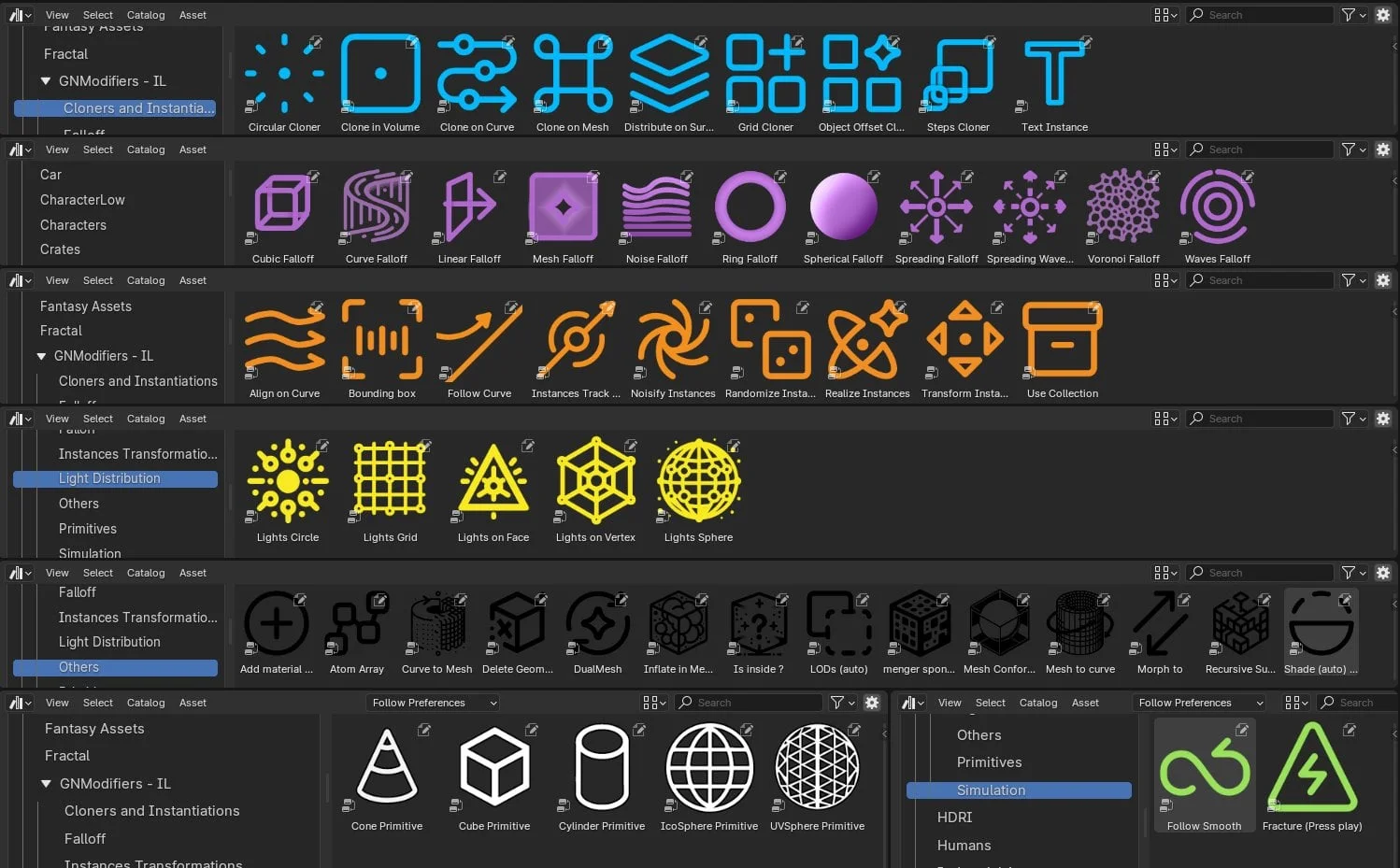 This asset pack provides a collection of Geometry Nodes modifiers designed for motion graphics workflows in Blender. It features a variety of tools categorized by function, including cloners, instancers, falloffs, and instance transformations. Users can build effector-driven setups by linking empty objects to falloff modifiers and referencing them in transformation nodes. The collection also includes light distributors, primitives, and simulation modifiers, all accessible directly through the Blender Asset Browser.