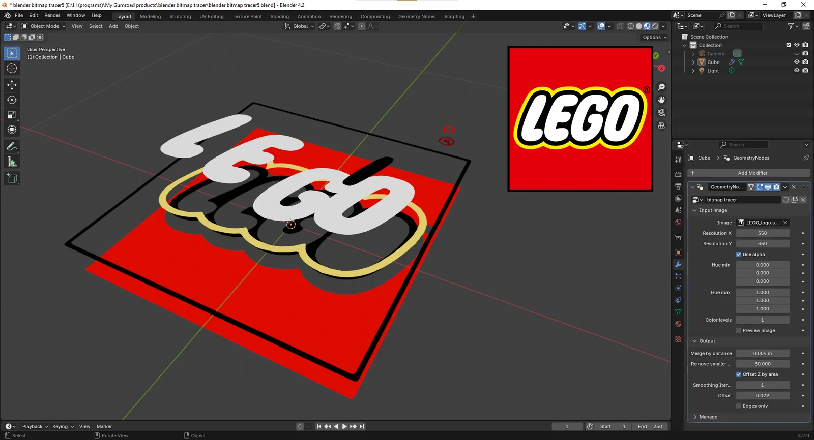 This Geometry Nodes setup traces bitmap images and converts them into procedurally generated 3D geometry. Users can control the input grid resolution, isolate specific color ranges using hue minimum and maximum values, adjust color steps, and utilize image alpha channels to remove transparent areas. A built-in preview option allows users to visualize color adjustments before finalizing the mesh processing.