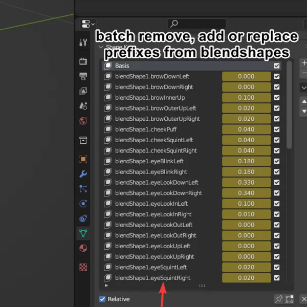 This add-on provides batch renaming capabilities for shape keys, commonly referred to as blend shapes, within Blender. It allows users to quickly add or remove text prefixes across all shape keys on a selected mesh object.