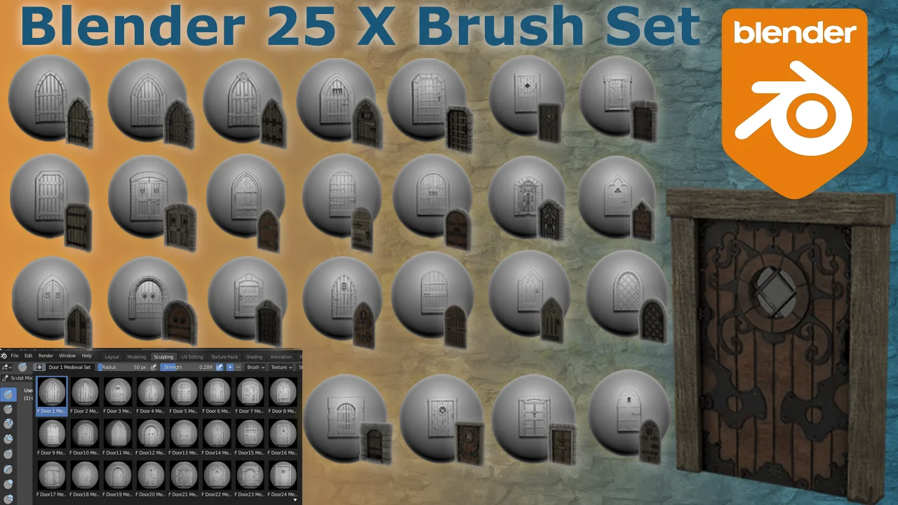 This collection provides 25 custom sculpt brushes and 25 alpha maps for detailing medieval door designs in Blender. The assets are designed for high-resolution sculpting, making them suitable for 3D printing preparation or rendering. Additionally, the pack includes 25 displacement maps, allowing for easy transfer of the detailed height information into texture painting software like Substance Painter.