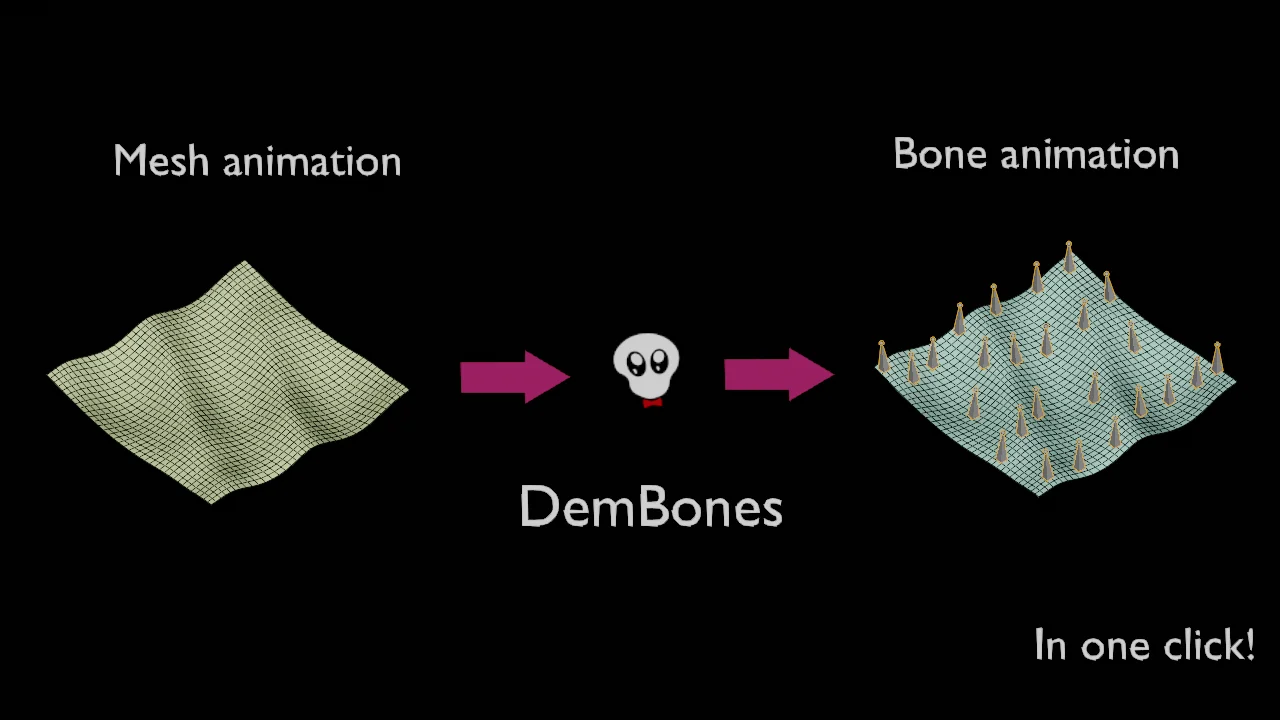 An integration of the open-source DemBones algorithm for Blender. It provides an automated process to convert mesh deformations, such as cloth or water simulations, into standard bone animations.