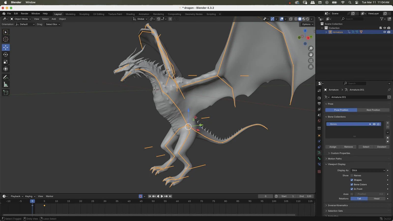 A basic, rigged 3D model of a dragon designed for posing and reference purposes. The geometry has been simplified to facilitate a 2D illustrated look, making it suitable for artists who want to draw over the model or use it as a structural base for illustrations.
