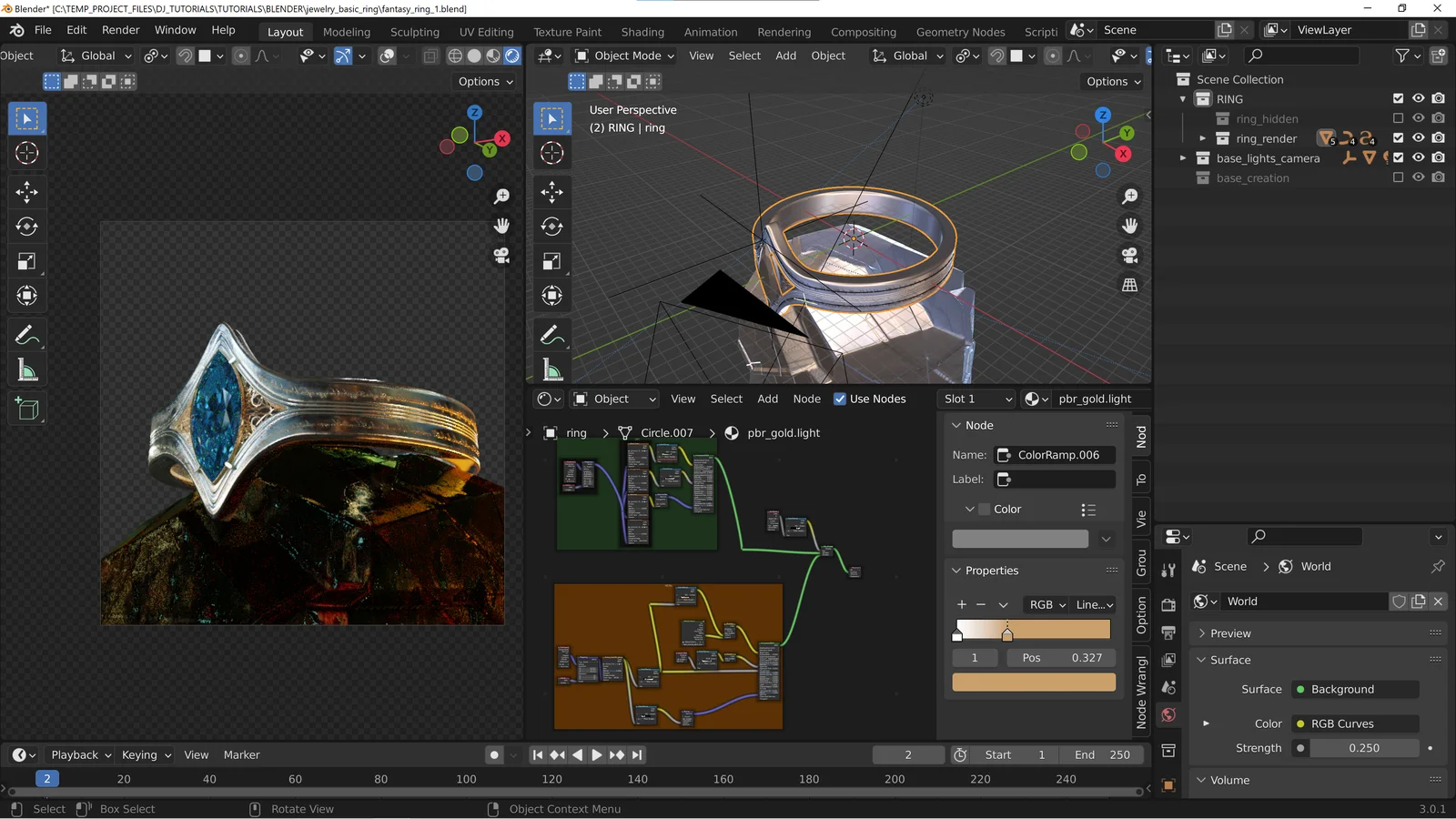 This project file serves as the companion to the Fantasy Ring conceptual tutorial series. It includes the complete scene setup used to generate the final promotional render, featuring the 3D ring model alongside all packed textures. The file contains the full lighting configuration and compositing node trees, allowing users to study the techniques used to achieve the final image.