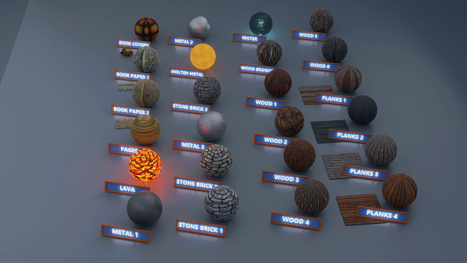 This collection provides 24 medieval-themed surface materials comprising over 130 individual texture maps. The pack includes a variety of surfaces suitable for historical construct and fantasy environments. Content categories cover architectural elements like wooden planks, wood branches, rock walls, and metals, as well as specialized surfaces including lava, molten metal, water, paper, writing elements, and book covers.
