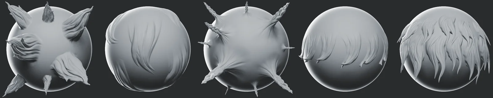 A demo collection of five Vector Displacement Map (VDM) brushes designed for sculpting hair and fur details in Blender's sculpt mode. The brushes provide ready-made surface displacements for adding fur texture to characters, animals, and creature models.