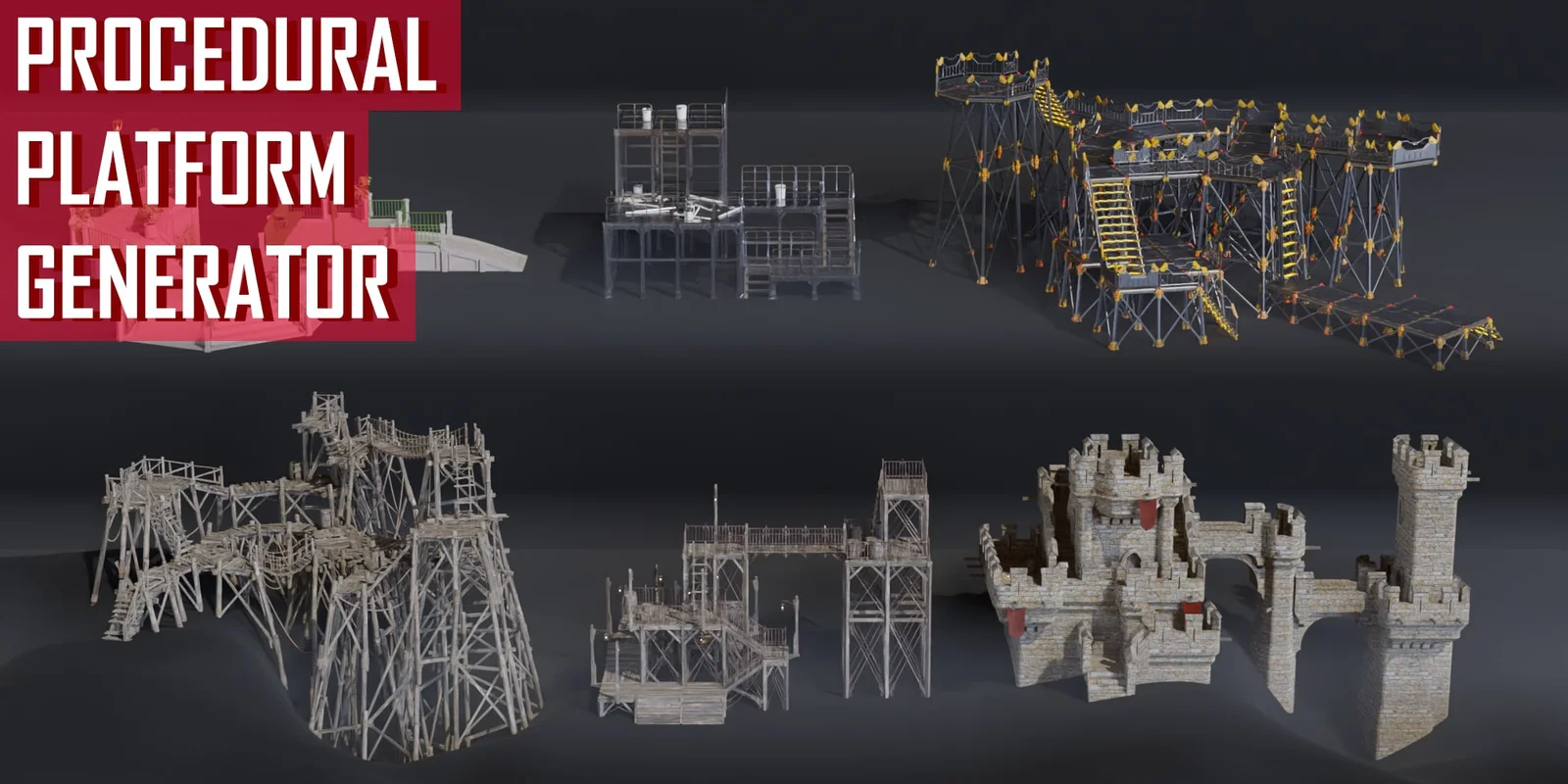 This Geometry Nodes tool generates complete platform structures from basic polygonal meshes. By modeling with simple quadrangular faces, the node setup automatically populates the geometry with structural elements. It spawns pillars at the vertices, support beams along the edges, and instanced planks across the faces following their general direction.