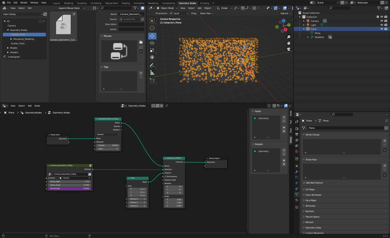 This is a Geometry Nodes setup designed to automatically delete points located outside the camera's field of view. The method relies on geometric calculations rather than raycasting, offering improved performance, though it will not cull points that are occluded by other objects within the frame.
