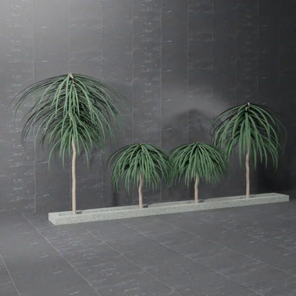 This geometry nodes setup provides a procedural generator for dracaena loureiri trees. Users can customize various parameters to create different tree variations. Adjustable properties include the overall dimensions of the tree, the total leaf count, and trunk shaping elements like curves and arches. The setup also supports custom material assignments.