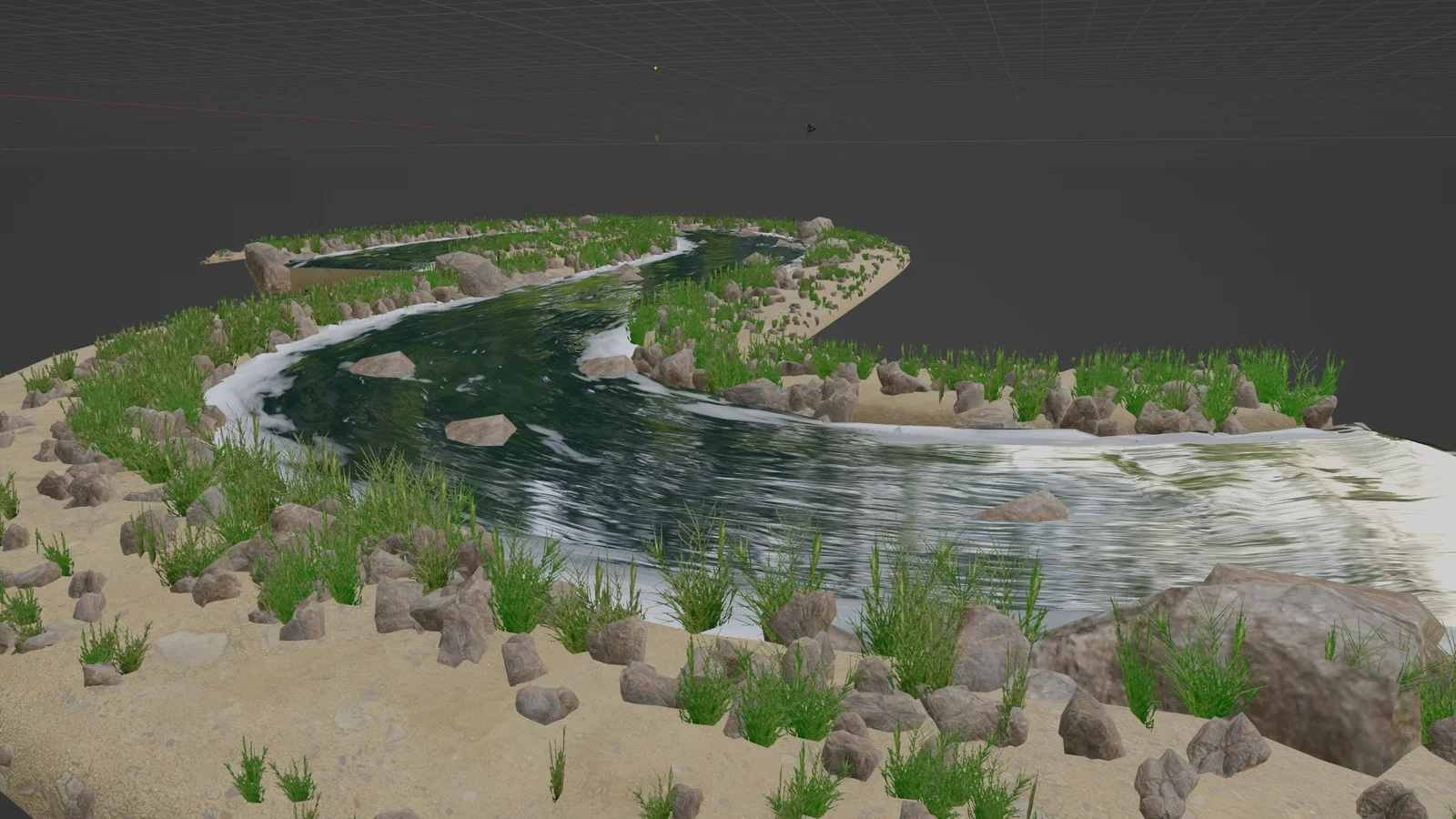 This Geometry Nodes system generates animated rivers along custom curve object paths. The water automatically animates to follow the direction of the drawn curve. It includes an optional water foam feature, which can be adjusted or removed using the Cycles materials directly in the modifier settings.