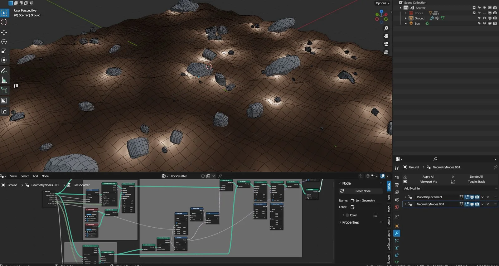 This geometry nodes setup provides tools for terrain displacement and object scattering. It uses fields for surface displacement and features a proximity detection system for instancing, allowing smaller objects to appear only near larger ones without intersecting. Scattered elements are managed through scene collections and can be adjusted using exposed node parameters.