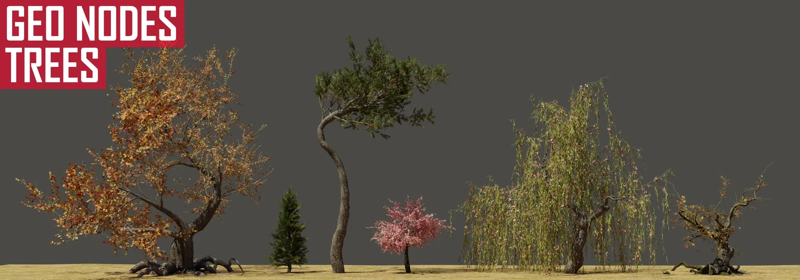 A Geometry Nodes setup that automatically generates 3D trees along user-drawn curves. Users define the general shape of the tree by drawing a curve in Edit Mode, then apply the Geometry Nodes modifier to adjust the details. The tool is intended for rapid asset generation, conceptual exploration, and filling background scenes. It includes pre-configured leaf collections and materials that utilize textures, allowing users to easily replace the source images to customize the foliage.