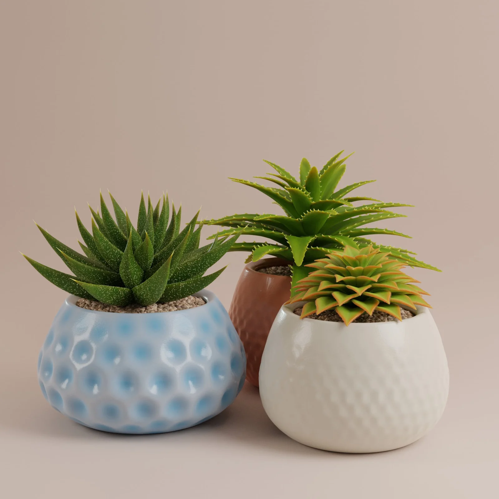 A Geometry Nodes system for generating succulent plants. The setup includes three distinct types of procedural plants. All materials applied to the generated geometry are fully procedural, allowing for customized botanical scaling and variation.