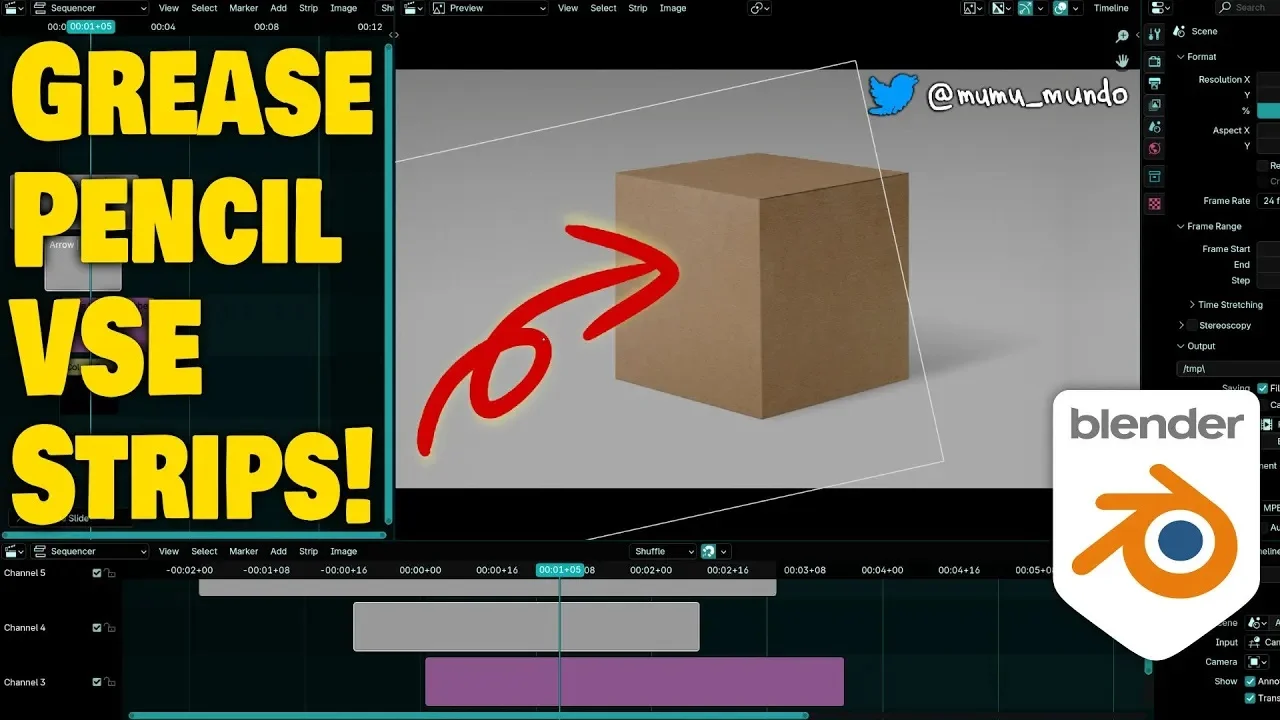 A collection of two animated Grease Pencil files designed for use as motion graphics overlays within Blender's Video Sequence Editor (VSE). These assets are set up to function as 2D animated elements layered over video sequences, originally created as supplementary material for a VSE workflow tutorial.