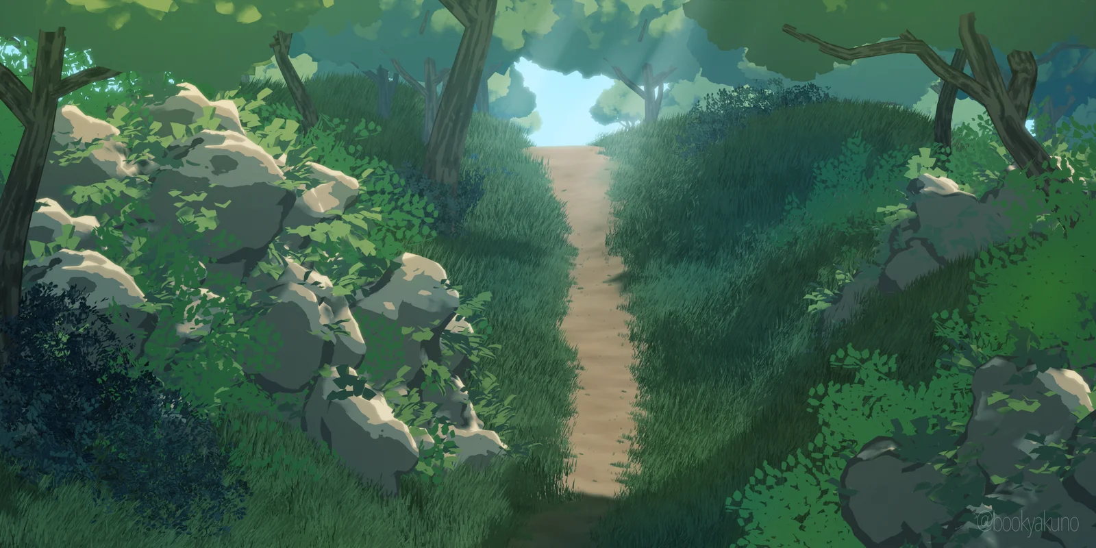 An illustration-style forest scene featuring models of grasslands, trees, and rocks. The environment includes meadows generated with particle systems and trees constructed non-destructively using modifiers. The scene is configured with illustration-like materials.