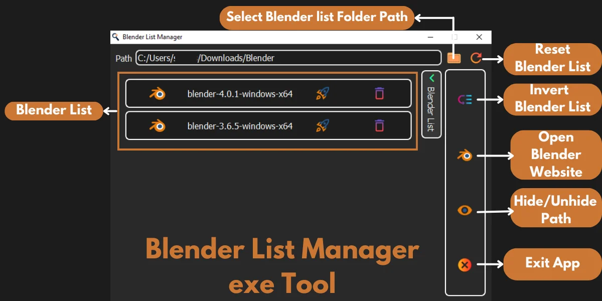 A standalone executable utility designed to organize and launch multiple portable installations of Blender from a single interface. Users consolidate their portable Blender folders into a central directory, which the tool uses to generate a unified version list. The application operates in real-time, storing configuration data in a local INI file rather than relying on JSON.