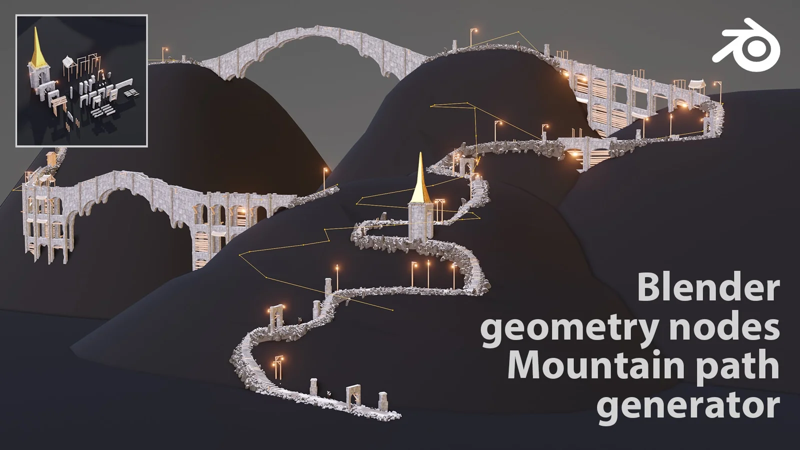 This Geometry Nodes setup allows for the procedural generation of mountain paths across varying terrain. The path automatically adjusts to follow terrain height variations, adapting to valleys and cliffs. It includes interconnected elements like stairs, bridges, and assorted props. Users can customize the setup by replacing the default collection of base elements with their own 3D objects, provided they adhere to the required size constraints.