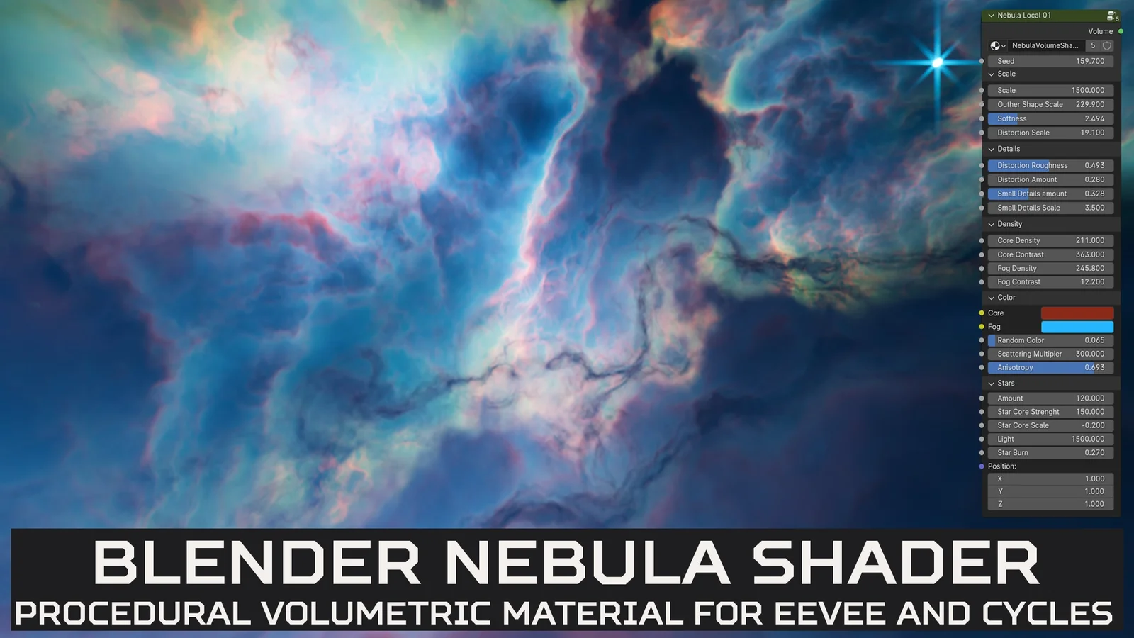 This package contains shader nodes designed to generate volumetric nebulae effects within Blender. It includes two distinct shader types: a Local shader for application on specific objects to create contained nebulae, and a Global shader for use with the world volume output to generate infinite backgrounds.