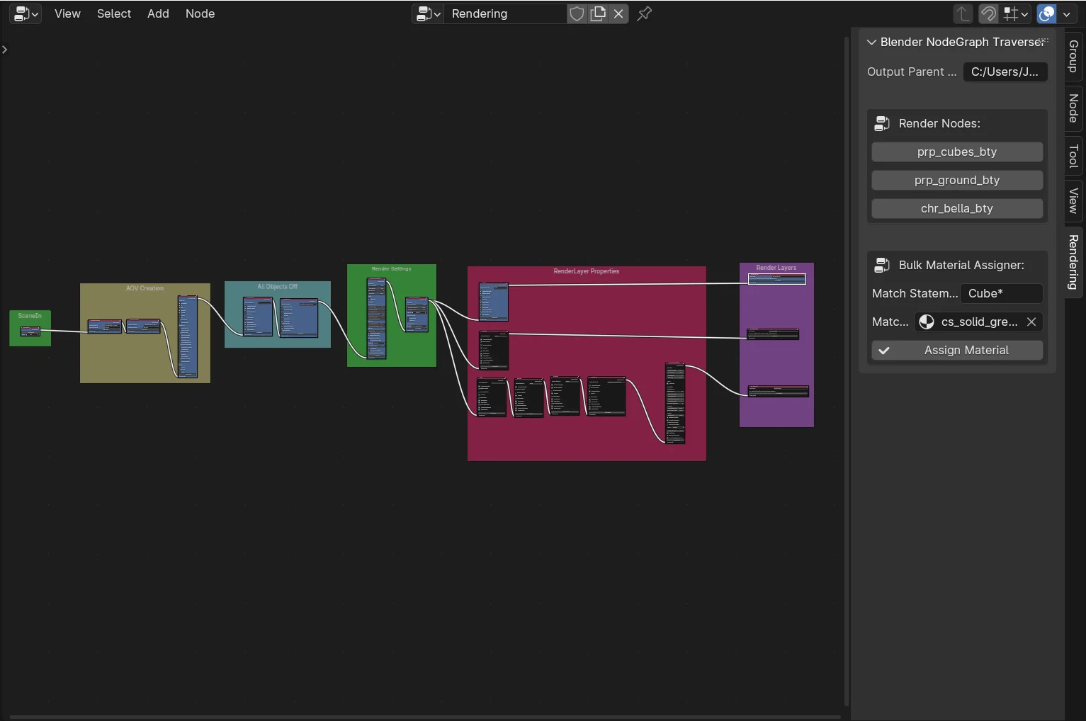 This add-on introduces a node-based rendering workflow to Blender, offering an alternative to the traditional layer-based system. Users can control object visibility, adjust render settings, configure AOVs, and manage layer naming entirely through a custom node editor interface. The tool is designed to streamline complex rendering tasks, making it suitable for VFX pipelines and production environments.