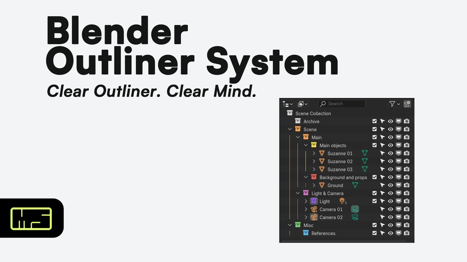 This educational template provides a structural framework for organizing the Blender Outliner. The included scene demonstrates how to separate different object types into color-coded collections based on relevance and hierarchy. It serves as a starting point for maintaining clean project files and improving object accessibility during complex workflows.