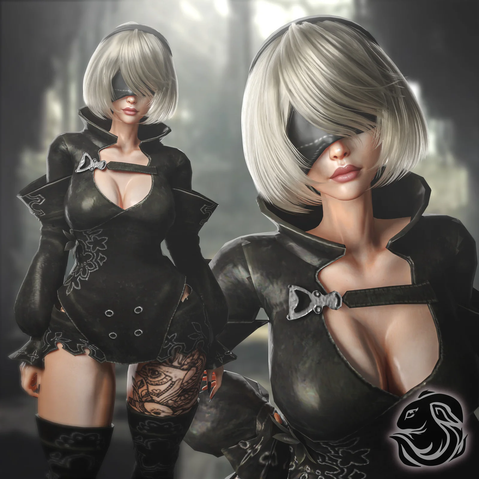 A 3D model of the hairstyle worn by 2B from NieR: Automata, created using Blender's particle hair system. The asset can be appended into existing scenes and adjusted using the comb tool in Particle Edit mode. Material colors can be customized in the Shader Editor. The viewport display is optimized with a reduced hair count to maintain performance, while rendering at full density.